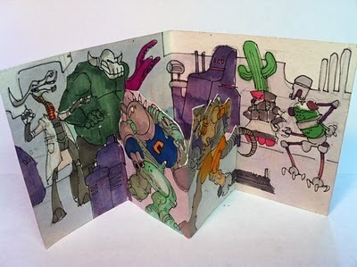 It's a very early pop-up that I made for a friend long before I even realized making pop-up books was even a career (between 1988-1992). This very simple layer fold features some of my own original characters (I had a whole silly yet complicated storyline filled with creatures, heroes, villains and robots back then), hastily illustrated in ink and markers. As I recall, I'd make these pops to be built into miniature comics for mixtapes (yes - it was that long ago) created for my friends. I went all out back then... too much time on my hands, I suppose. Kinda neat, huh?