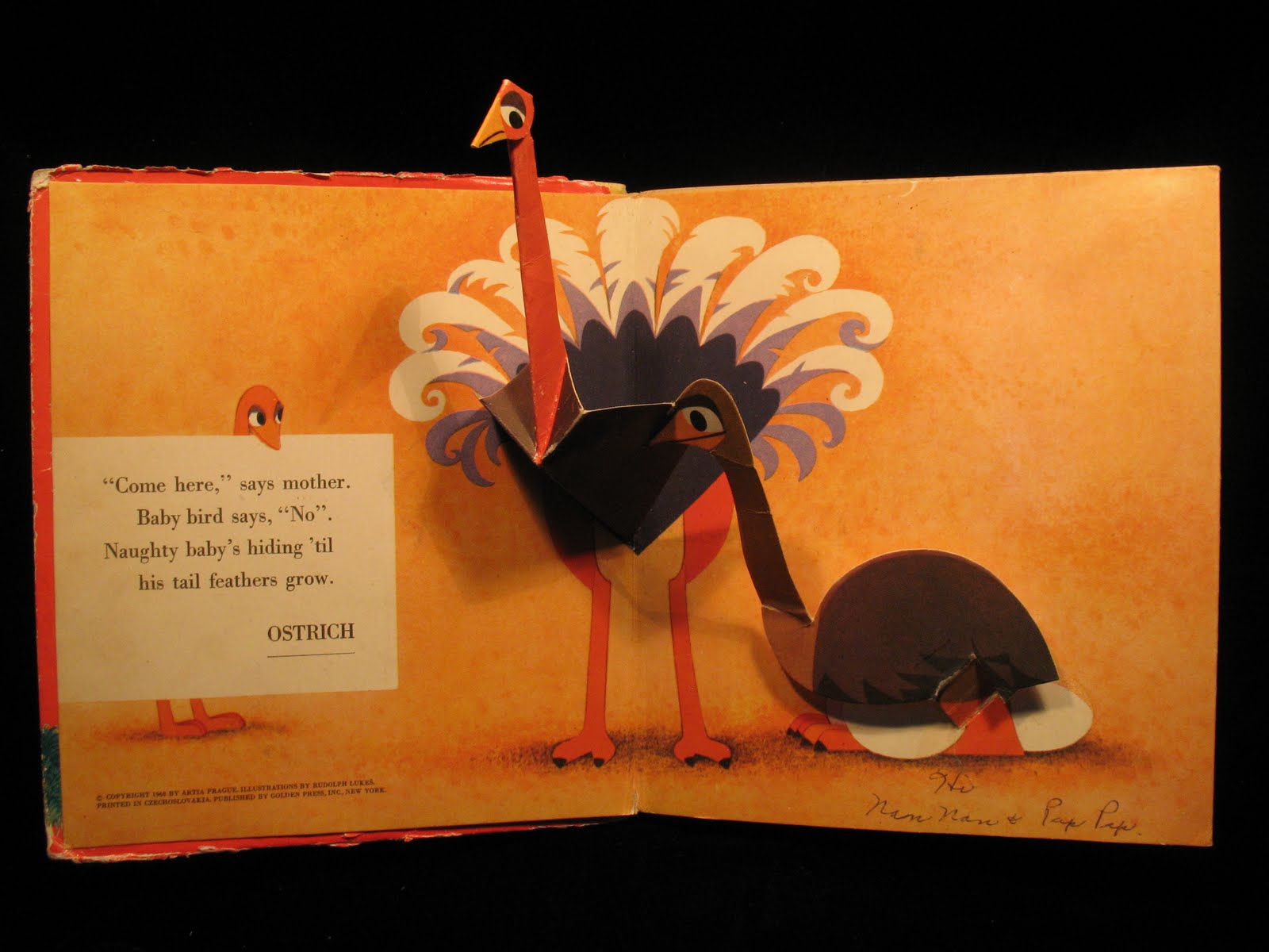 While Vojtech Kubasta is my favorite illustrator to come out of Czechoslovakia in the 1960's he is by no means the only artist I admire from that era. Rudolph Lukes was an illustrator for the country's publishing giant, Artia Prague. His color palette and design aesthetic are decidedly of the time and I find a certain charm in his depiction of animals. On display today is Turtle and Her Friends that was printed for Golden Press in 1968. We are all familiar with Golden Books and their ubiquitous gold spines lining most children's bookshelves, but they did venture into a limited pop-up venture.