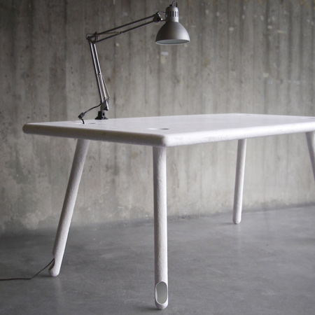 The table's legs are hollow, making channels for plugs and cables to stay organized and out of the way! So simple, and so smart. More images and info