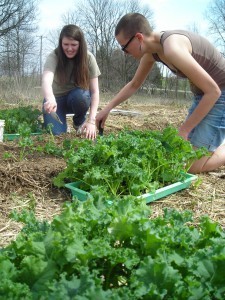 Gabriella Donofrio ’13 (left) and Alice Bowe ’13 sort and plant lettuces at Harvest of Joy Farm in Shelbyville, MI.Amy Newday plants seeds in soil (she runs her own farm), and she plants seeds in students...