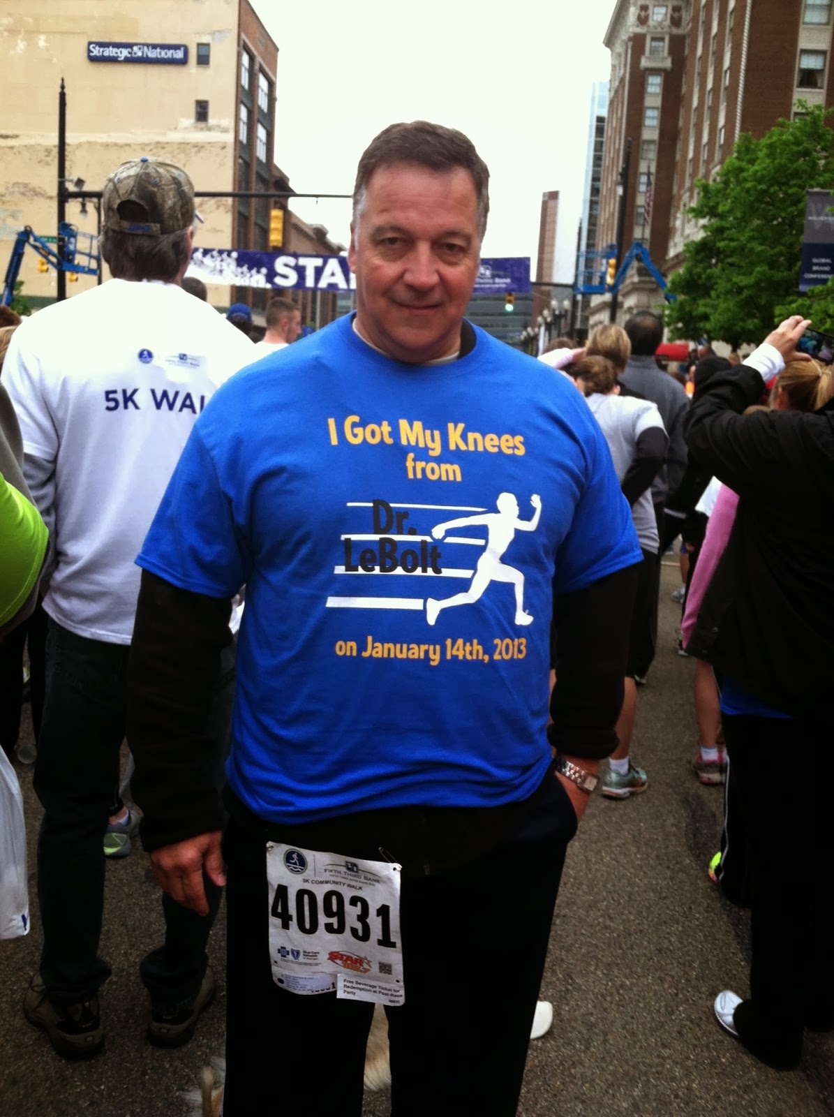Ed DublisA patient story I wrote for one of Michigan's largest health care organizations about a man so grateful for his double knee replacement that he participated in a 5K race just a couple months later to say Thanks, Doc. He was #40931, and Edward Dublis walked proud, wearing a bright blue shirt for all to read: “I got my knees from Dr. Lebolt on January 14, 2013.”