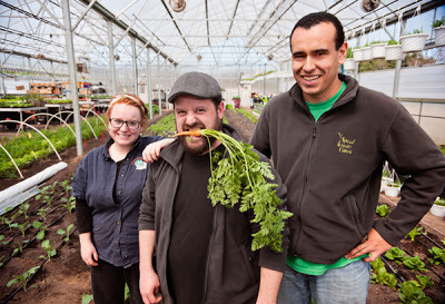 JEREMY ANDREWS, CEO OF SPROUT URBAN FARMS WITH EMPLOYEES REBECCA SPICER, LEFT, AND DEVON GIBSON, RIGHT, INSIDE THEIR GREENHOUSE IN BATTLE CREEK, MICHIGAN. - ERIK HOLLADAYA community gathering to talk about ways to improve life where they live led to organizing a farm in the city. Zinta Aistars has the story of Sprout Urban Farm.
