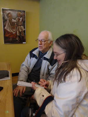 Reporter Sherry Kuyt interviewing Viestarts Aistars at Daily Brews Cafe in Wayland, MichiganAn article appeared in Penasee Globe about my parents, Velta and Viestarts Aistars, this week, in part about my father's art exhibit currently on exhibit at Daily Brews Cafe in Wayland, Michigan, but also in celebration of the upcoming Valentine's Day.