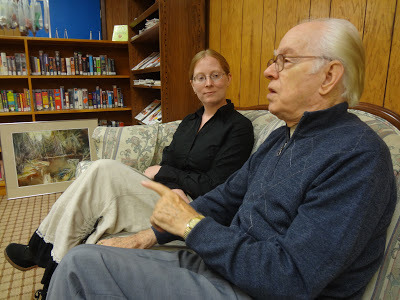 Natalie Bazan, library director, talking to artist Viestarts Aistars