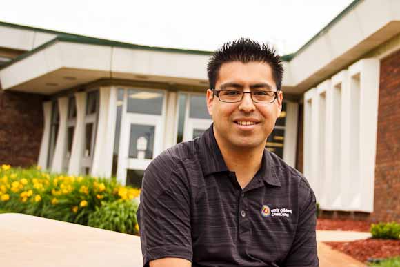 Israel Flores (Photo by Susan Andress)You’ll find him on the floor, playing among the children. Israel Flores, family coach for Battle Creek’s Early Childhood Connection since 2011, is happiest there.