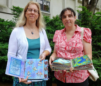 Lorrie Grainger Abdo, left, and Katie Platte, right, holding altered books