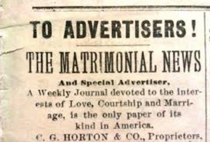 In the 1870s, 80s and 90’S, Matrimonial News, a San Francisco based matchmaking newspaper helped to make love connections between the single men of the West and the statistically disadvantaged, single women back East. For $1.50 a word, people could place classified ads describing themselves and what they wanted in a potential mate. The paper’s goal was to “promote honorable matrimonial engagements and true conjugal felicities for amiable men and women.” If a match resulted in a wedding, both parties were required to pay an additional fee to the newspaper.