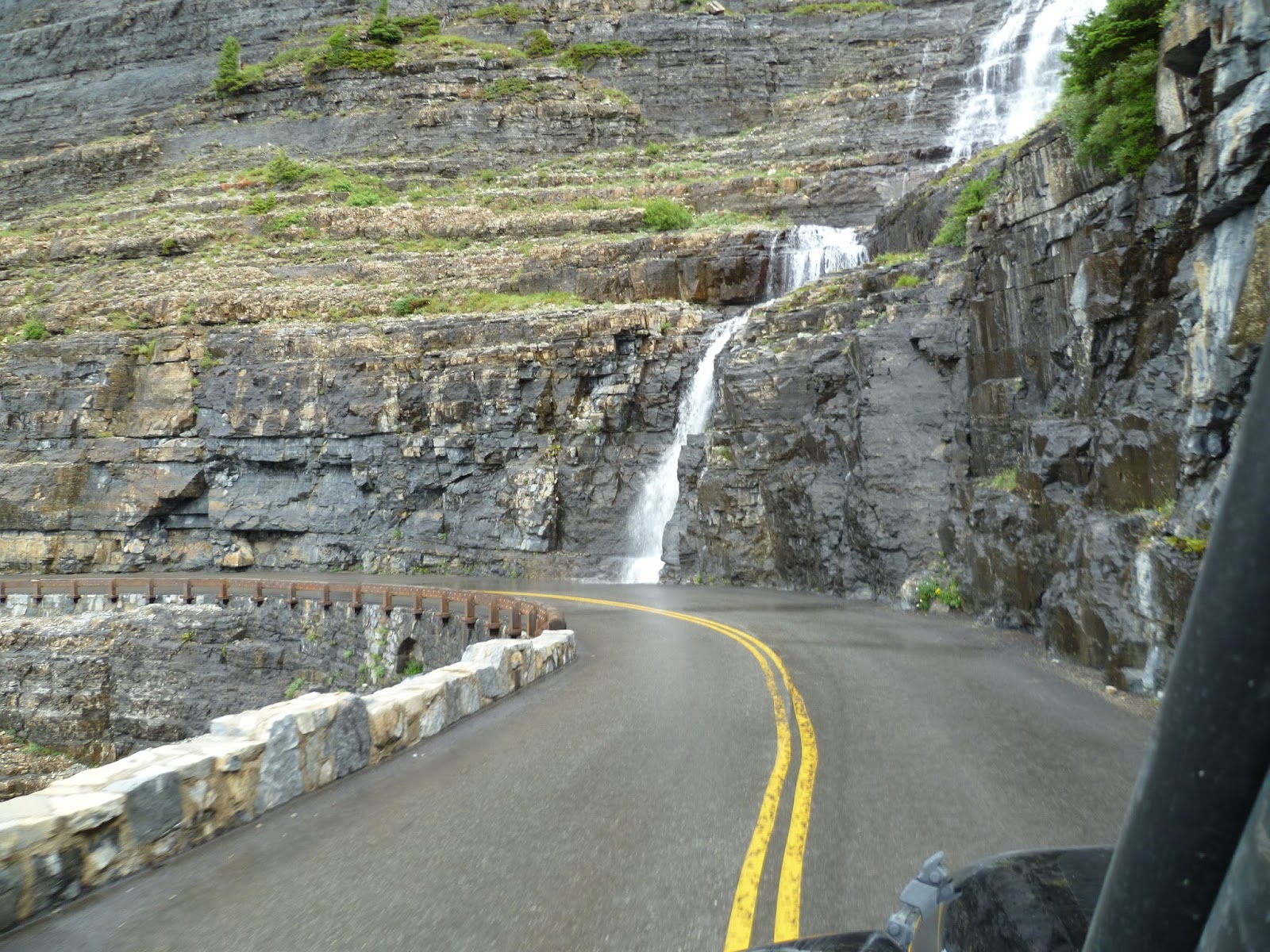 HOLY MOSES! Twists, turns, hairpin switch backs, waterfalls, wildlife, and by the time we’d reached Logan Pass, the clouds were socking the park in and the rain was beginning. Add several thousand feet drop-offs, sheer cliff walls on the other side of the road, shoulders to the road of no more than two or three feet and it was the most stunningly gorgeous white-knuckle drive I’ve ever undertaken. At several points during this drive, snow splattered the windshield with the rain. Yeah, I was white-knuckling it. And my respect for those people who drive those snow-movers in the early summer to open the road increased exponentially.