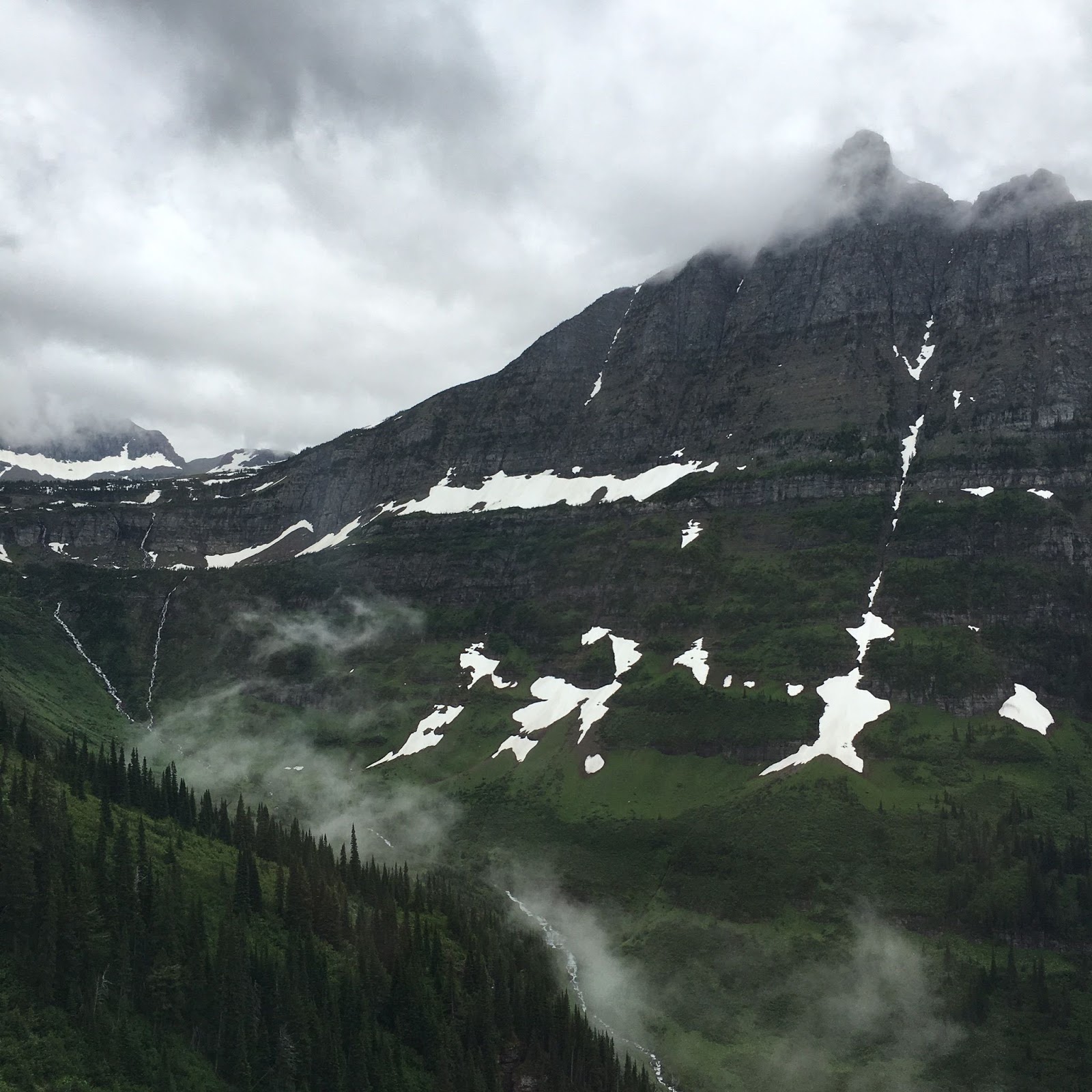 HOLY MOSES! Twists, turns, hairpin switch backs, waterfalls, wildlife, and by the time we’d reached Logan Pass, the clouds were socking the park in and the rain was beginning. Add several thousand feet drop-offs, sheer cliff walls on the other side of the road, shoulders to the road of no more than two or three feet and it was the most stunningly gorgeous white-knuckle drive I’ve ever undertaken. At several points during this drive, snow splattered the windshield with the rain. Yeah, I was white-knuckling it. And my respect for those people who drive those snow-movers in the early summer to open the road increased exponentially. (Some of the pictures I’ve shared here I did not take—and I’ve tried to give credit where credit is due.)