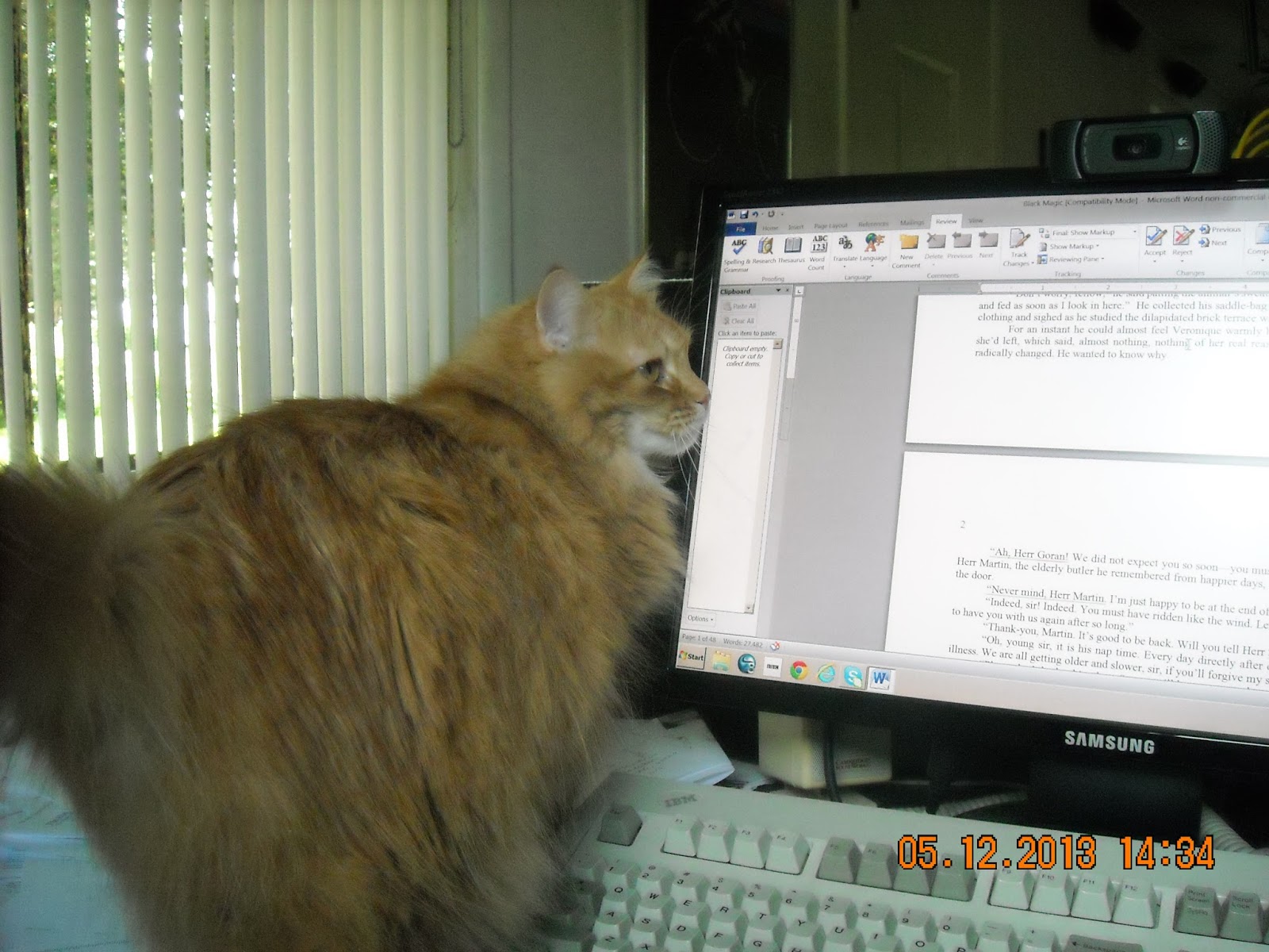 Many writers have cats. I’m one of them. Still, sometimes, I wish I'd never gotten hooked on the furry little tyrants when they do things like stand in front of the monitor (butt in your face), or lie on the keyboard, or step on it--unfailingly when you have 5 windows open and are in the middle of filling out some life-and-death form. Or they decide to recline on your forearms while you are typing. (There's worse pictures, but I spared us.)