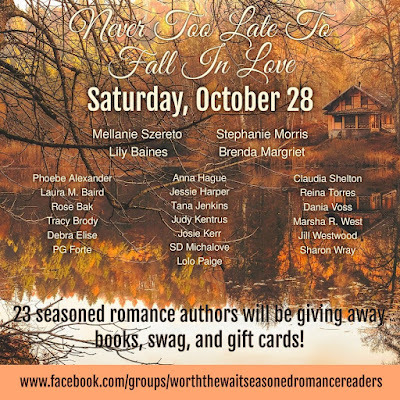 It's almost here!!! Be sure to join the Worth The Wait Seasoned Romance Readers group in order to participate in their fun fall event, Never Too Late To Fall In Love, on October 28!