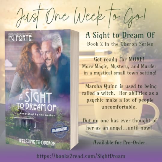 A Sight to Dream Of, book 2 in the Oberon series, releases in just one week! This is a slow-burn, hero in peril, later in life, paranormal romantic suspense story featuring a (47M) big city financial wizard and the wounded, small town witch (37F) who unwittingly saves him.
