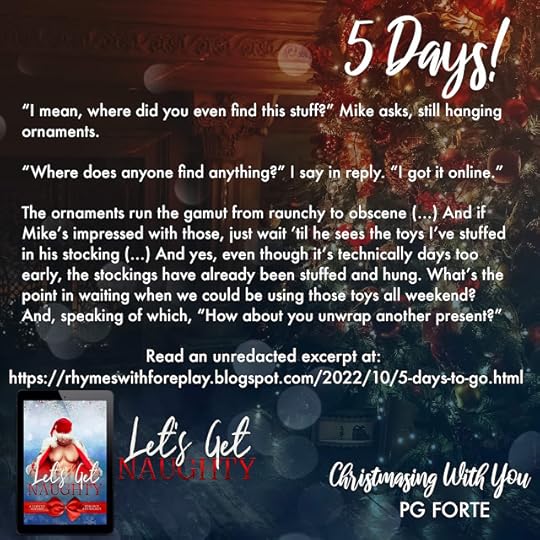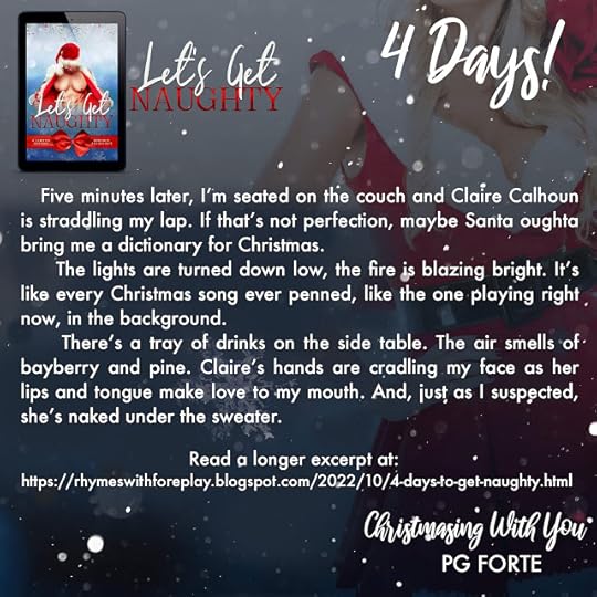 Whoo-hoo! Let's Get Naughty is getting ready to drop--only 4 more days! 36 steamy stories to spice up your holiday reading. Includes my contribution, Christmasing With You, which features Mike and Claire from Let Me Count the Ways.