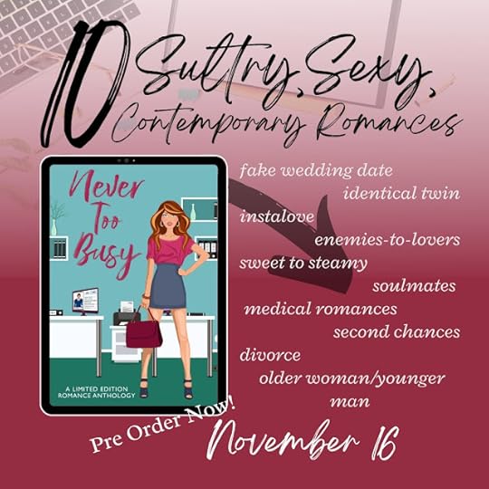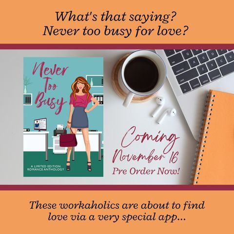 The characters in this limited-edition anthology have been—until they come across the Never Too Busy Dating app. It caters to professionals thirty-years of age and older and promises to match them with the person of their dreams. After all, workaholics deserve a happily ever after, too.