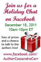 The first one is going on now. I'm late, actually. Big surprise, huh? It's a multi-author, live chat and it's happening at Cassandra Carr's Facebook page: http://www.facebook.com/BooksByCassandraCarr