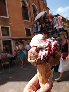 Welcome to another Tasty Tuesday. The inspiration for this week's recipe comes from a few sources, including the chocolate-amarena gelato my daughter enjoyed in Venice last week (that's it over there on the left) and Nick Greco, one of the heroes of my Oberon series, who has an abiding love of all things chocolate-and-cherry, especially as they pertain to his wife...