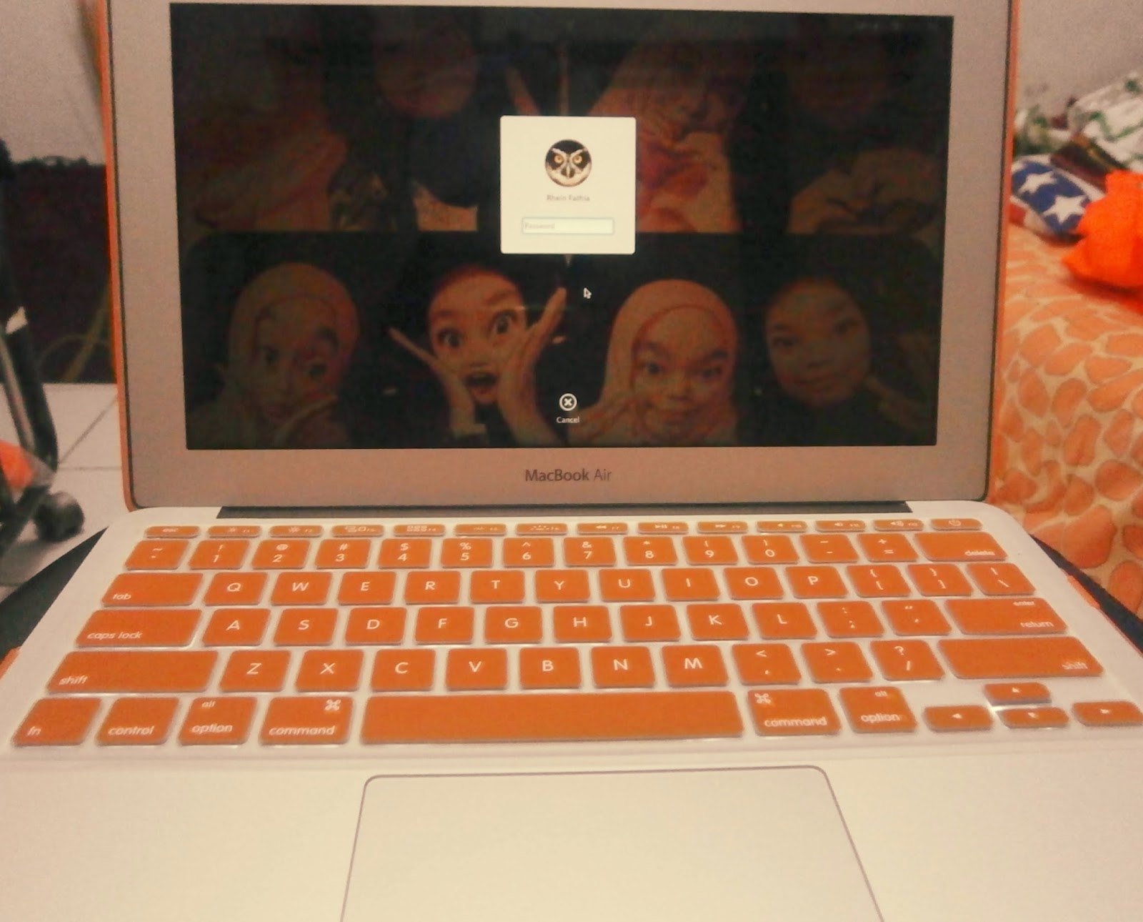 The Orange-AppleKok warnanya oranye? Oh, adik yang baik hati membelikan cover case-nya karena Rhein pecinta warna oranye. Laptop aslinya sih silver-silver elegan gitu... Sukses membuat tabungan terkuraaaasss.. Namun, rasanya puaaasss banget! Karena sejak setahun lalu Rhein ngincer Macbook Air 11" ini. Kecil, ringan, mudah dibawa-bawa, batre awet sampai 9 jam! Untuk yang sering lupa tempat & waktu kalau lagi ngetik, ih ini laptop bermanfaat banget. Ngetik di kafe, kampus, rumah, airport, sampai di bis sekalipun kalau lagi ada ide nulis bisa langsung dikerjakan. Udah gitu, ngga perlu lama proses menyalakan ni laptop karena sekali buka, ngga sampai 5 detik udah bisa ngetik. Kecanggihan keyboard yang menyala di laptop ini juga membuat Rhein bisa nulis bahkan saat gelap. Cihuy! :DAwalnya Rhein kira bakal kesulitan menggunakan OS Macbook karena beda dengan Windows. Ternyata oh ternyata, Macbook sangat gaptek-user-friendly. Mudah banget digunakan & dipahami. Senang.. senang... Semoga laptop ini membawa berkah dan bisa menemani Rhein dalam menghasilkan banyak tulisan yang berkualitas.