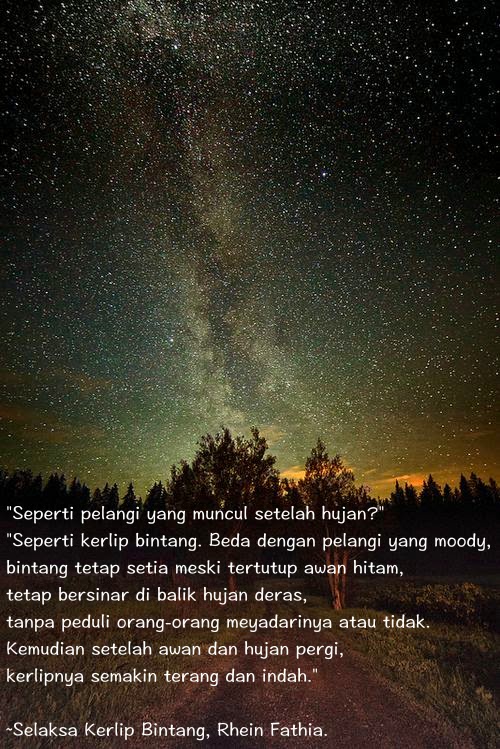 Sebenarnya, setelah menulis thriller-crime-romance, kemudian banting stir menulis tema ala keluarga cemara dengan alur lebih lambat, rasanya agak kagok. Apa ya sebutannya? Author hangover? Bagaimana pun menurunkan tempo dari yang super cepat di The Gloomy Gift, lalu harus menekan rem kuat-kuat di Selaksa Kerlip Bintang cukup bikin otak saya berkali-kali bilang, "No, you should keep calm. Re-read this scene, you need to put detail here and here, you need to put the warm soul here and here.". Kira-kira begitu.
