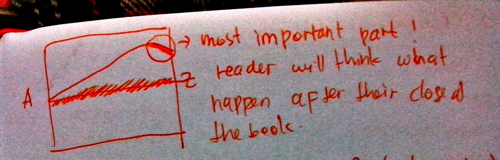 gambar dan tulisannya jelek, tapi penulisnya tetep cantikIni didapat waktu ikut workshop di Ubud Writers Readers Festival. Ibarat sebuah grafik, cerita yang kita tulis pasti dimulai dari perkenalan (A), ketemu problem, konflik-konflik kecil muncul, tensi semakin naik, klimaks, lalu turun perlahan. Nah, menulis kata TAMAT ini jangan setelah klimaks dengan lanjutan penjelasan 'kemudian kehidupan mereka bahagia selamanya, si A menikah dengan B, punya anak bernama C yang lucu imut. Mereka tinggal di sebuah desa kecil dan rumah sederhana. Di depan rumah mereka ada tukang sayur yang dan di sampingnya tinggal tukang daging. Mereka..bla..bla..' boring, ngga penting, terlalu turun moodnya.