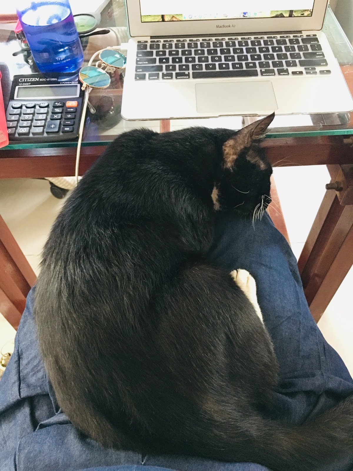 But mostly, we had good times and sweet memories. He loved surrounded by family, so he will joined us watch TV or just took a nap together. He was smart and sneaky especially for food. First, he will lured my sis to gave him food. After he succeed getting food from her, he will lured my bro to gave him food. Then he will lured me, Mom, and Dad, so he could get lot of food. That's why he became fat. He was so clingy and loved to hug, kiss, or just lay on my lap while I was working. He was cute and warm, so I don't mind. As he also became cat in our office, he loved to meet clients or just follow wherever Mom moved while talking on the phone. And he never missed any chance if we had employee meeting. He'll acted as the boss, of course.
