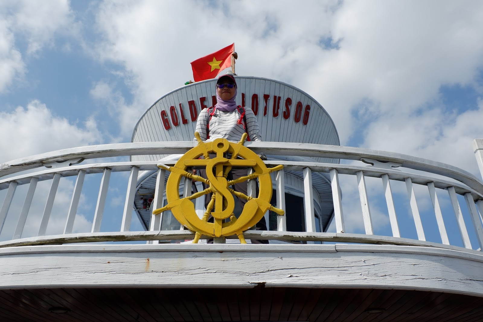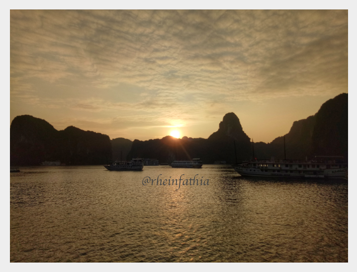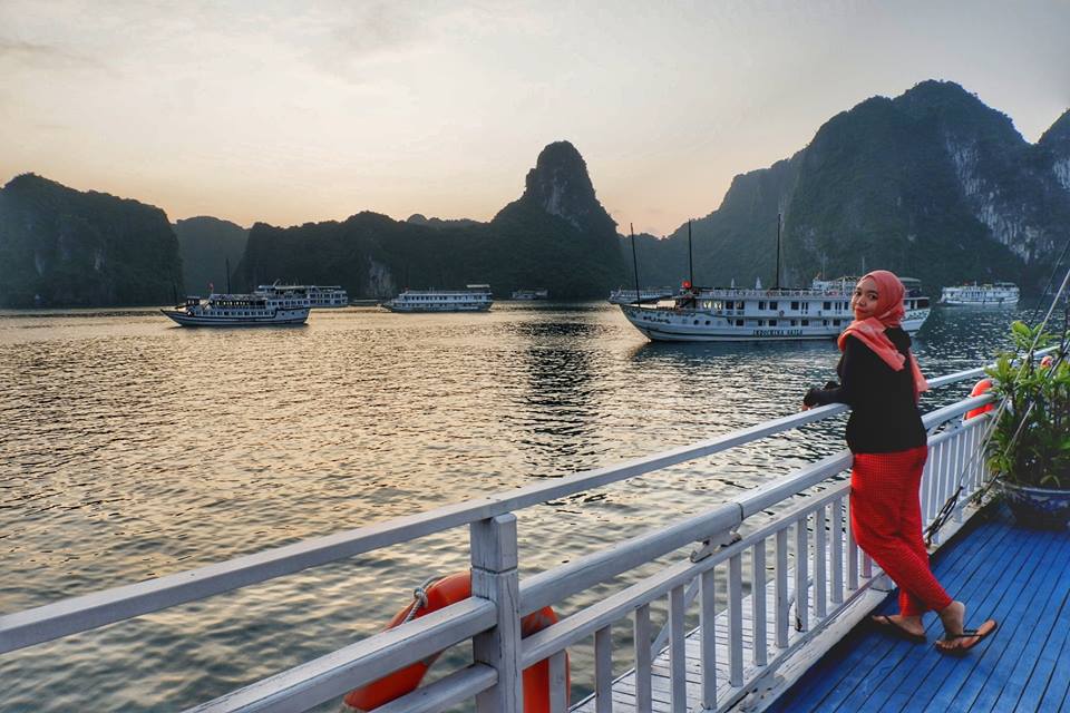Udah iri belum?Awalnya saya pikir karena mendaki pulau ini melelahkan, bakal sedikit yang niat banget sampai ke puncak. Eh ternyata penuh! Susah banget mau ambil foto juga. Untunglah saya berbadan mungil jadi bisa nyelip di antara ketek para bule untuk ambil foto di atas. Oh, pas di sini kami ketemu pasangan dari Afrika. Usia keduanya sekitar 40an tahun dan sempat minta tolong adik saya untuk ambil foto mereka berdua. Ternyata yah.. hapenya Nokia jaduuuuuuullll pisan yang kamera masih VGA gitu. Dan hanya itu satu-satunya gadget yang mereka bawa. Kami agak sedih pengen menawarkan memfotokan pakai kamera kami dan dikirim melalui email tapi sayangnya mereka nggak ngerti bahasa Inggris. Namun mereka tetap senyum-senyum dan berbinar bahagia. Yah, sejatinya selama saling bersyukur bersama orang terkasih, kondisi apa pun bisa bikin bahagia kan.Makan malam di kapal menyenangkan. Kami sudah request makanan halal selama di kapal. Semua seafood dimasak dan disajikan dalam keadaan masih segar karena sebagian mancing langsung selama perjalanan. Usai makan malam, saatnya santai-santai di dek kapal menikmati langit berbintang sembari terombang-ambing di laut tenang. Sebenarnya banyak tour keliling Ha Long Bay yang menawarkan perjalanan sehari tanpa menginap. Tapi saya selalu suka sensasi terasing, jauh dari hingar bingar, tanpa sinyal di hp, tenang di bawah langit malam.