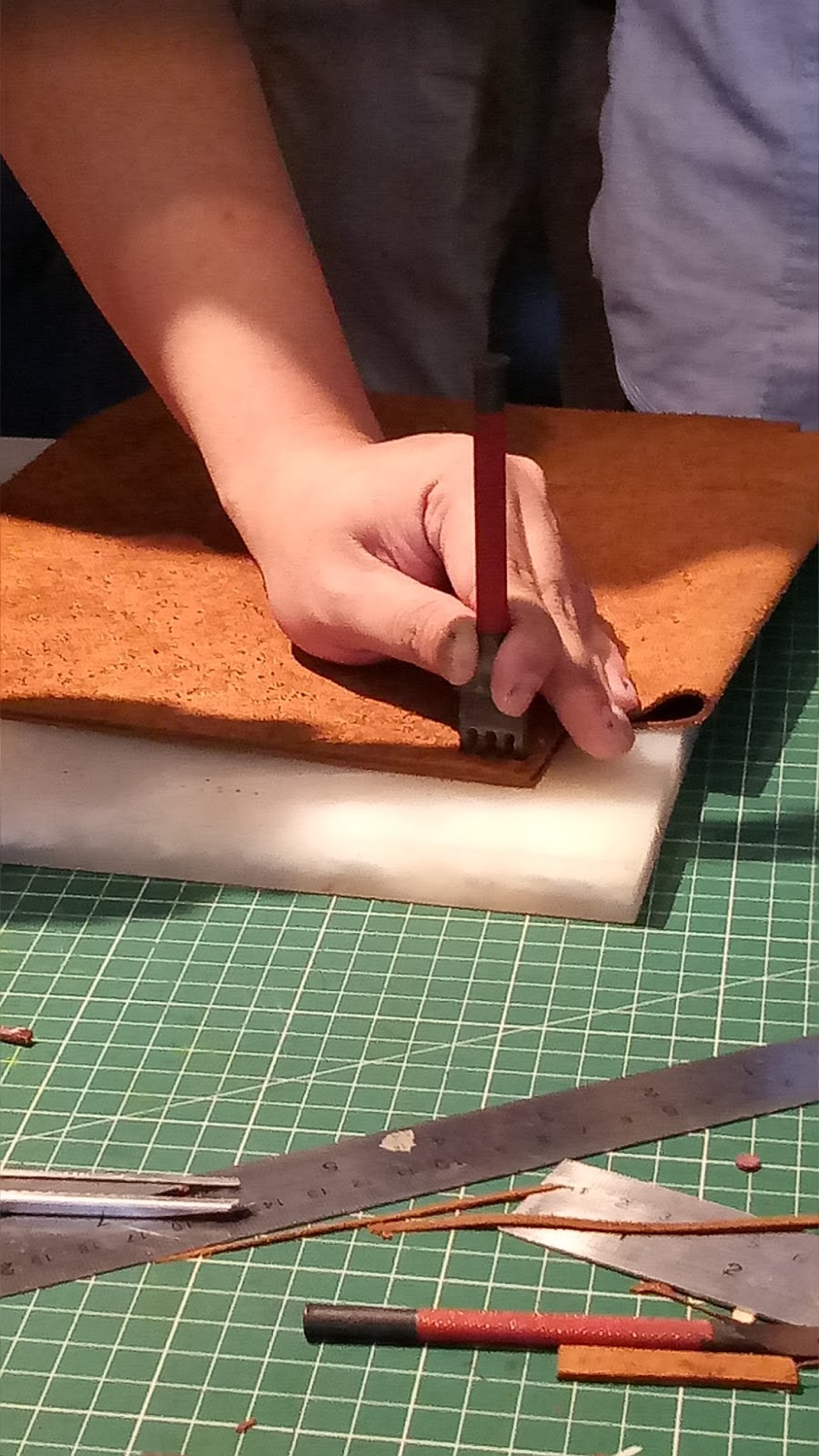 Selesai tahap dasar, mulai diajarkan bagaimana teknik membuat lubang bagi yang perlu dibuat lubang. Pas bagian ini berasa banget jadi tukang karena harus pakai palu. Jadi sekelas berisik banget sama suara jdak-jdok. Apalagi karena pembuatan tas kali ini tanpa mesin jahit, untuk bagian yang perlu dijahit perlu dibuat lubangnya dulu di sepanjang jalur jahitan. Karena kalau nggak begitu, susah banget nusuk pakai jarumnya.