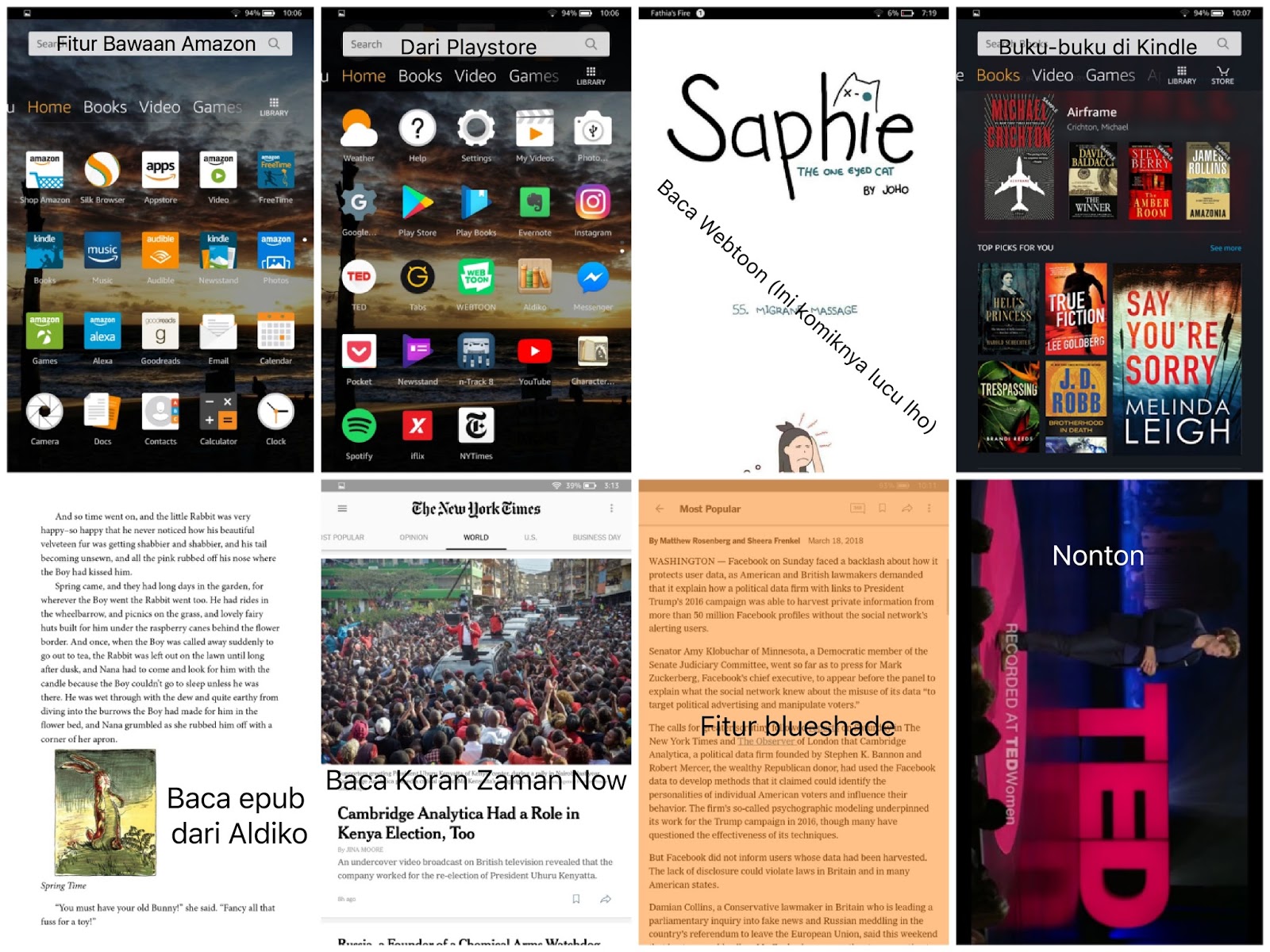 Untuk kebutuhan menulis, Evernote selalu menjadi andalan karena tersinkronisasi dan bisa diakses dari beragam gadget. Untuk kebutuhan membaca, nah ini yang seru. Di tengah derasnya informasi, saya sadar bahwa bahan bacaan harus berkembang tidak hanya melalui buku, majalah (iya, saya masih baca majalah cetak), dan ebook. Saya perlu lebih dari sekadar Kobo Glo. Maka Amazon Fire HD 8 ini bisa memfasilitasi saya untuk membaca ebook (format PDF, epub, mobi, dll). Lalu saya bisa mendapat berita-berita terbaru melalui Newstand dan NYTimes. Baca komik perlu dong... Standar lah dengan Webtoon. Karena sekarang saya punya hobi baru (nonton TED), tablet ini punya resolusi layar yang oke banget. Urusan musik pun terfasilitasi karena saya bisa rekaman ukulele atau dengar lagu dengan speaker yang menghasilkan suara kece (Dolby, coy!).