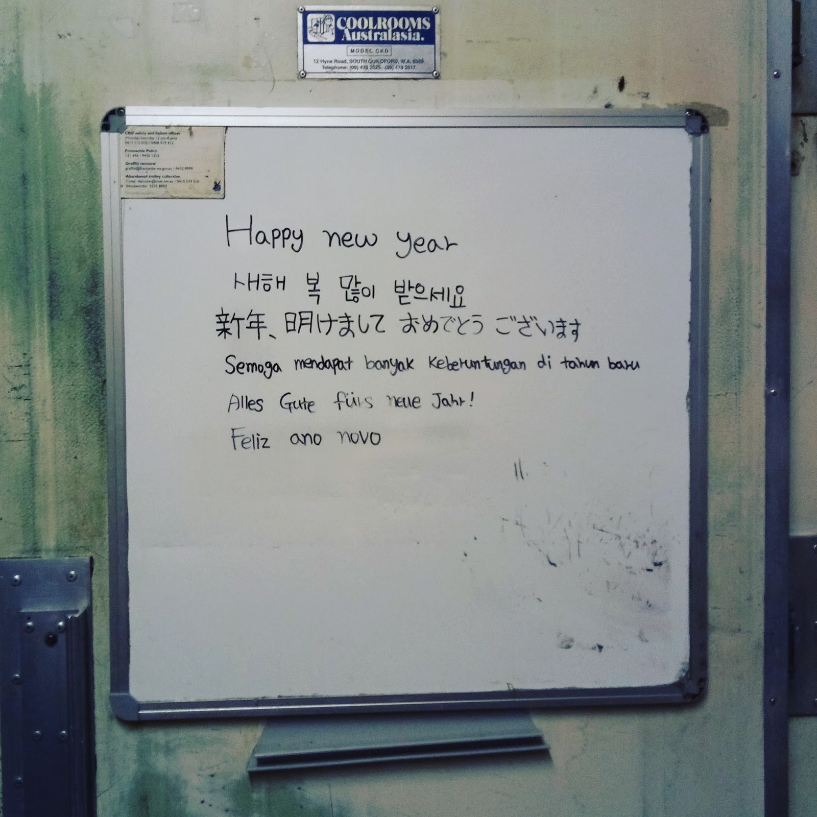Harapan tahun baru dari bahasa masing-masing pegawai restoranHidup di Australia sebagai traveller membuat saya bertemu dengan banyak manusia dari berbagai negara dan ras. Saat menjadi waitress saja, restoran tempat saya bekerja memiliki karyawan dari Indonesia, Jepang, Korea, Brazil, Chile, India, Portugis, Finlandia, dan Jerman. Warna kulit kami berbeda, warna rambut tidak ada yang sama, warna bola mata pun berlainan.