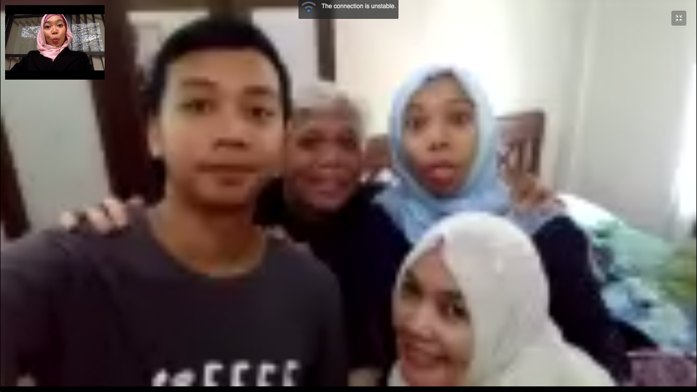 Saya tidak akan cerita bagaimana muslim Indonesia di Australia yang ternyata banyak banget. Sepulang shalat dan makan-makan, saya sudah janjian dengan Bani akan melakukan video call. Keluarga Syahroni sudah ada di rumah nenek di Purwakarta. Siap dengan laptop berkamera dan LINE dengan wifi memadai, video call pun tersambung. Kemudian, muncullah mereka di layar laptop saya, Bapa, Ibu, Uki, dan Bani.