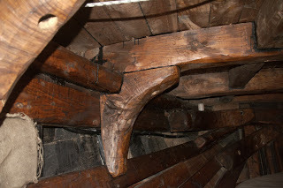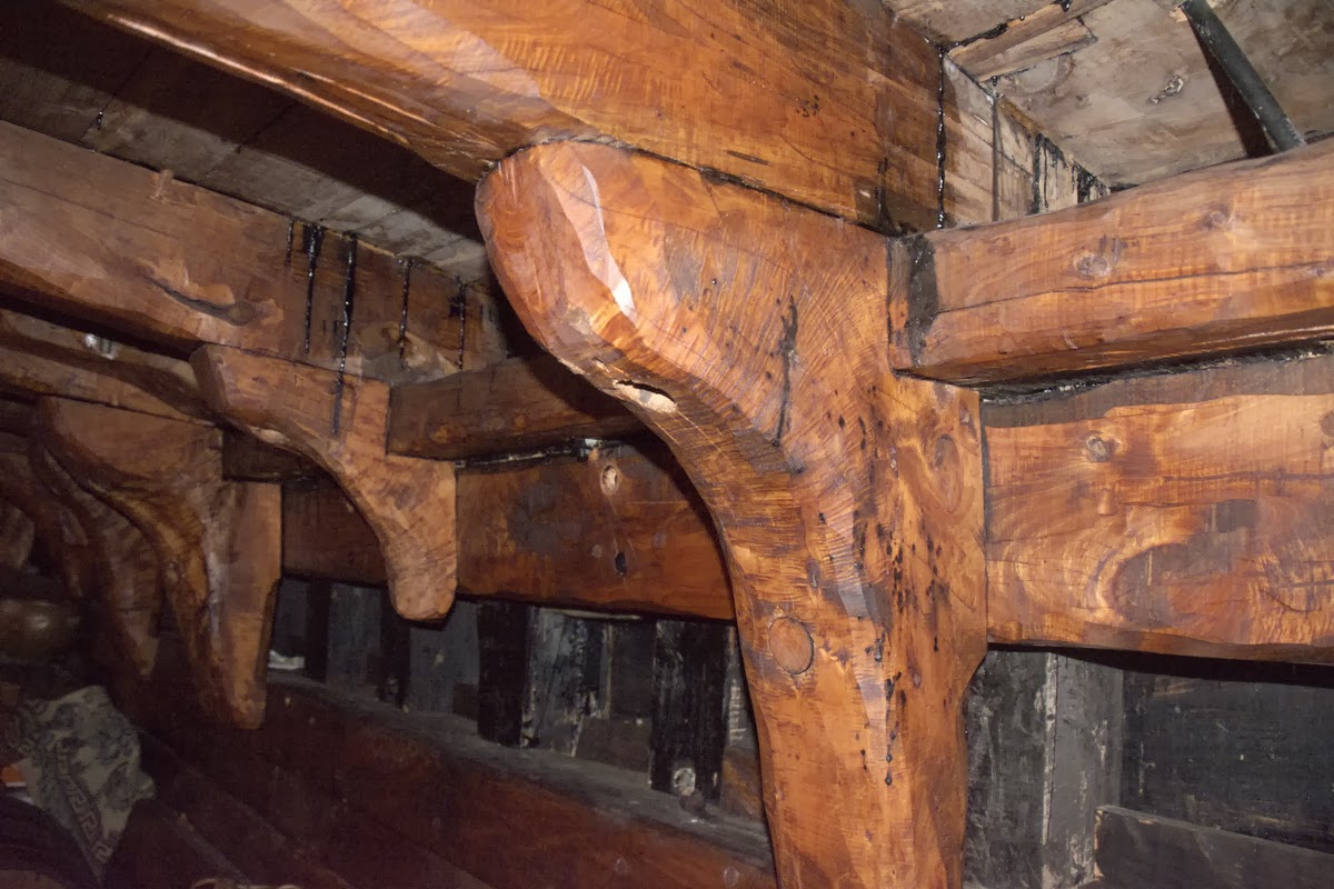 These photos show some of the heavy woodwork, carvings, handrails, hatch, cabin, and construction of the hull.