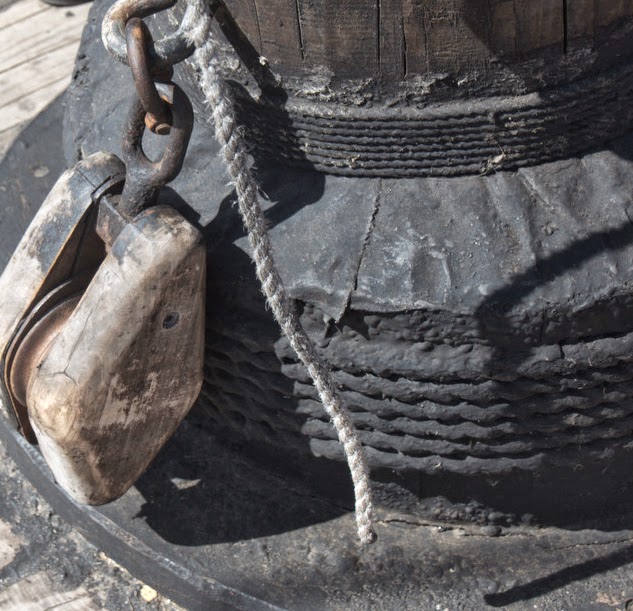The base of the mast showing an old wooden pulley.