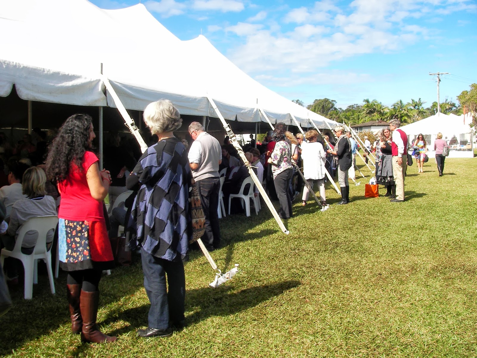 Lunchtime: sunshine, good food, time to absorb.First off the realisation all the tents were established close together and distance would not be a problem banished any 'Splendour in the Grass' memories of slogging through muddy fields between tents.