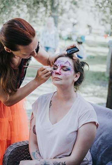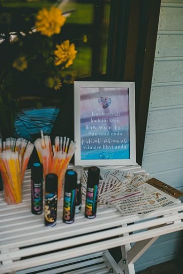 Päev enne pidu tuli mulle mõte, et kui meil juba festivaliteema on, võiks me kohale kutsuda ka näomaalingute tegija. Ei ole see midagi ainult lastepidude värk – viirelaiul oli ka mega äge, et näomaalinguid sai teha ja kuna ma tean, et Katu on mitmel üritusel sama näomaalija käest ägedaid maalinguid saanud, siis mõtlesin igaks juhuks küsida, et kas ta on vaba ja oligi! Jeee! Ausalt,see tegi peo mega ägedaks, et kõik olid suht ühesugused ja … värvilised.