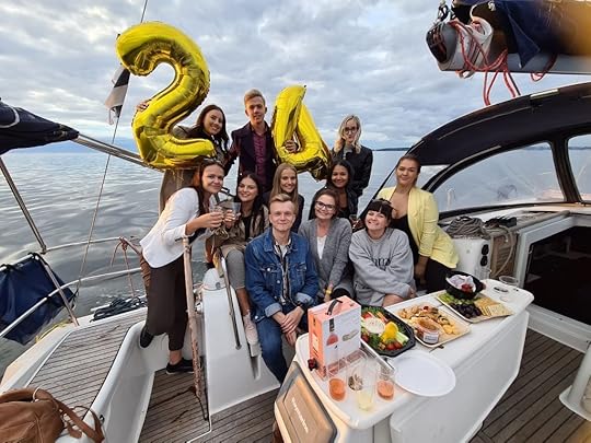 Kristina ise oli Siimuga Pärnus ja arvas, et ta sõidab koju, aga õnneks ta passis telefonis ja ei pannud tähele, et Siimuke rahumeeli Virtsu poole sõitis. Alles sadamas tõstis Kristina pilgu ja juba me seal olime ja lehvitasime, shampa käes. Wohhooo! Seega võtsime asjad selga ja ronisime paati, et Viirelaiule jõuda. Alguses sadas veits vihma, aga tuju oli hea, kohapeal ootasid meid snäkid ja mull, seega oli peotuju kõigil laes.