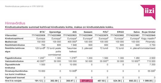 Igatahes saime me mingi 71 lehe pikkuse pakkumise, kus olid kõikide reisikindlustuste hinnad ja tingimused kirjas, lõpuks valisime nende seast Seesami välja. IIZI ise soovitas, sest Seesam on ainukene, mis ei rakenda pagasikindlustuse juhtumi korral piirangut üksiku eseme hüvitamisel. See on meile väga oluline kuna kaasas on vanker, kaamera, playstation, läpakas jne, et palju kallist tehnikat, mis võib katki minna või ära kaduda. Ise poleks jällegi taibanud otsida nii.