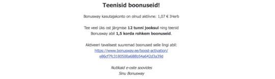 Kui tahad ka Bonuswayga endale väikest lisakopikat lasta tiksuda ja plaanis alede ajal netis shopata on, siis liitudes SIIN LINGIL saad kohe enda kontole 3€, kui esimese ostu sooritate.  Vot tak. Mina ei saa sellest mitte kui essugi, nii et pakkumist võivad kasutada ka heiterid