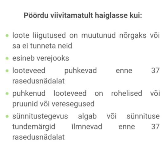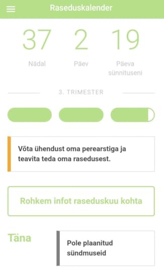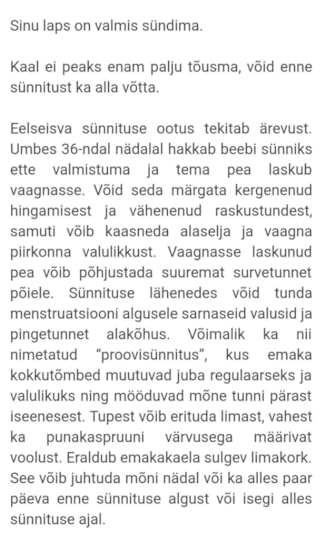 Kokkutõmbeid, või noh, seda, et kõht krampi läheb, seda on juba kuid olnud, viimasel ajal aina rohkem, aga mis siin ka imestada, lõpp on üsna lähedal ka. Kõiksugused muud sümptomid, mis ennustaksid peatset sünnitust, puuduvad täielikult. Öeldakse küll, et enne võib hakata limakorki tulema või midagi, aga kuna mu kaks eelmist sünnitust on nii üks ühele olnud, siis ma juba tean, et kui ma mingit pruunikat voolust nägema hakkan, siis ilmselt on sama päev minek.