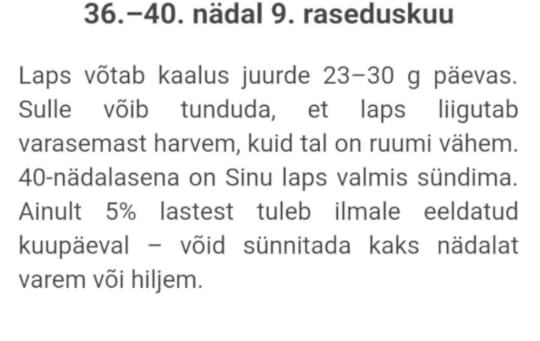 Öeldakse, et laps peaks nüüd vähem liigutama ka, aga mina seda täheldanud ei ole. Pigem ütleks ma, et ta just rohkem seal rabeleb ja liigutab ja rullib. Võimatu on normaalselt istuda, kogu aeg mingi sabimine sees käib. Aru saada on, et ta on ikka… suur.