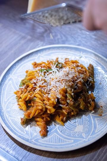 Siinkohal võib tegelikult veel palju asju lisada – küüslauku, sibulat, seeni, oliive, kana, sinki, peekonit – pasta võlu, pea kõik sobib sisse. Kardo ei lisanud aga midagi, segas kõik lihtsalt kokku ja lõpetuseks riivis kõvemat sorti juustu peale. Ei tea mina, kas kõht oli tühi või mis, aga see pasta oli nii hea ja need rohelised oad sobisidki pastasse imeliselt. Just sellised mõnusad värsked krõmpsud igas ampsus, proovige järele, ausalt on hea!