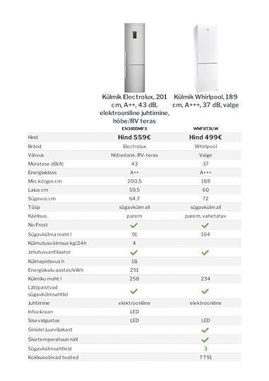 Teine kandidaat oli Electrolux (LINK), mis on 201 cm kõrge, A++ märgistusega, kuid samas mahukam. Tavaline külmikuosa 258 liitrit suur ja sügavkülm 91 liitrit. Veits kallim ka, 559€. Avastasin e-luxi kodukalt võrdluselehe ka, siis Kardoga koos uurisime seda siin. Mulle tundus, et A+++ võidab A++ masinat, aga samas see Electrolux tundus lõpuks ikka asjalikum loom olevat. Või noh, mina oleks valinud Whirlpooli, aga Kardo valis Electroluxi ja kuna mul laias laastus vahet polnud, siis sai Kardo soov ja võtsimegi selle.