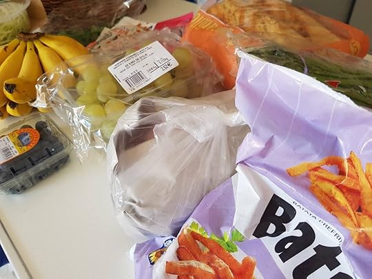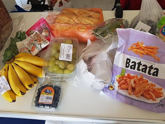 Korandrit ma armastan nii väga, et seda läheb igale söögile. Banaanid, viinamarjad, mustikad ja vaarikad on laste lemmik snäkk. Vaarikad sõime taksot oodates juba kahjuks ära, ei jõudnud nad pildile. Paberkotis on 5 ahjust tulnud saia, mis maksavad seal 1€ kotitäis. Bataadifriikaid maitsnud pole, aga mulle väga meeldib bataat, siis ma loodan, et need on hääd