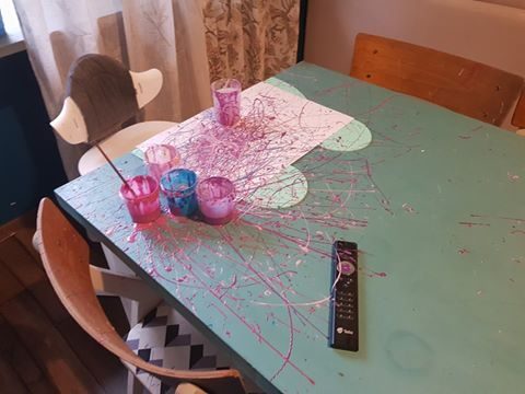 Pritsimistehnikas katta nii paberi, kui ka kardinad, toolid, diivani, laua, põranda ja isegi natukene lage. Ei saanud pahaseks, ma sain kohe aru, et see nii lõppeb, aga ma lihtsalt tahtsin 10 minutit meilidele vastata.