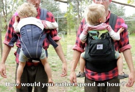 Ma alles hiljaaegu nägin Kristiines meest, kellel oli oma laps selles mitteergonoomilises kotis, noh, laias laastus on see ju nagu tugevast materjalist trussik. Vaene poisslaps hängis seal kottipidi ja tal tundus väga ebamugav olevat, lisaks oli isa koti veel valesti kinnitanud ja mitte pingule tõmmanud, seega tolknes see vaene poiss tal endal jalgevahel. Mees kõndis, nagu tal tolkneksid jalgevahelt poolde põlve kotid välja, tal oli ebamugav, lapsel oli ebamugav. Ta vist sai ise ka sellest aru, sest ta üritas kuidagi kätega toetada last, aga ma olen üsna kindel, et naljalt ta enam last ei taha kanda kotiga ja ütleb pigem, et ah, see on ebamugav ja lapsele ei meeldinud, selle asemel, et taibata, et viga oli kotis ja selles KUIDAS ta seda kotti kandis.