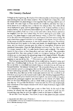 reader’s attention and pulls him into the world of the story. Cheever introduces his hapless protagonist, Francis Weed, on a plane that’s about to make an emergency landing. In the scene, Francis is a spectator: his fate rests in someone else's hands and all he can do is watch events unfold. Cheever’s masterstroke is showing Francis to the reader from the outside, allowing us some distance, which enables us to take in the larger scene and share intensely the helplessness of everyone on the plane. Cheever selects language that is lulling and arranges the words to create a smoothly flowing and gently rhythmic syntax. The paragraph ends with stillness and held breath. In that moment, when the passengers don't know if they're going to live or die, an eerie silence takes hold as the plane is being buffeted by the weather. And out of the silence, faintly but distinctly, emerges the sound of the pilot singing.