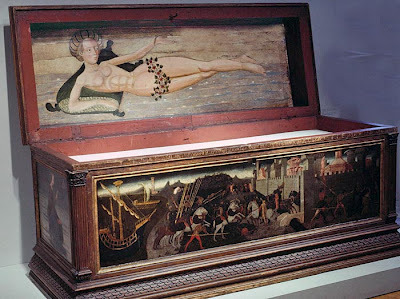 This chest was also made in Florence and depicts a famous battle. It is made of cedar and is decorated with gold leaf and oil on wood paintings