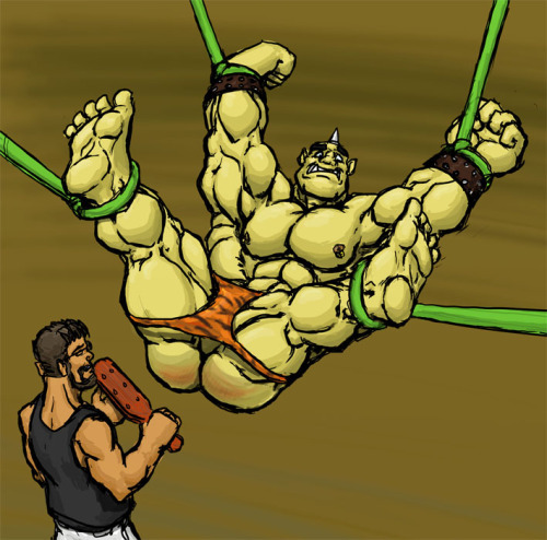 So this was a little thank-you of sorts. I’ve still been trying to get some more interesting poses and situations to trap studs in, and his hunky (hee!), dumb (squee!), underclothed (YAY!) oni Slab seemed like a great candidate for a different type of punishment humiliation good-natured teasing. With a bit of outside assistance, natch. Poor guy! But hey, he’s enormous, he can withstand that inadequate little paddle, right? RIGHT?