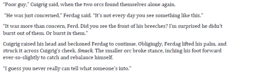 Reminder that Patreon supporters get a 4k-word story featuring Ferdag from Tusks: The Orc Dating Sim getting up to some kinky houghmagandie with a pal this month! There’ll be new stories each month for supporters, so if you’ve got a buck to spare, please consider supporting me in making Tusks (among other games and things that are really gay that you can find out about in my Patreon newsletters)~