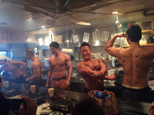 Source : Located in Tokyo, the Macho Nikuya (“nikuya” can mean “butcher” or “meat shop”) is staffed by musclebound men who are prone to flex poses while serving up raw beef.
