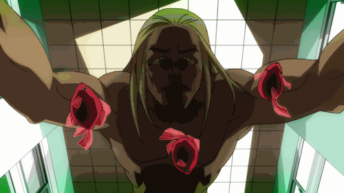 So, last night a friend showed me that there’s apparently a game called “J-Stars Vs” which is basically a Shonen Jump all-stars fighting game. All the characters have “SUPER CRAZY MOVE GO” cinematics and poses, and when some of them go into Asskick Mode they get new costumes and models. Naruto turns into that half-spirit-fox form I guess he has, Goku goes super saiyan, etc. Kenshiro (from Fist of the North Star) gets SO FIRED UP THAT HIS SHIRT NOnchalantly vanishes. Like, what. I mean hey, A+ bod I’m not complaining about, but just…what. (it’s around 3:05 if the video doesn’t automatically start around that time)
