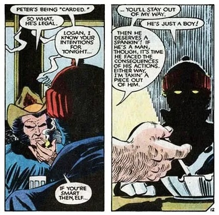 And in “Spankify Everything,” here’s Wolverine not only threatening to spank Colossus, but reserving the right to actually do so if he deems it necessary: